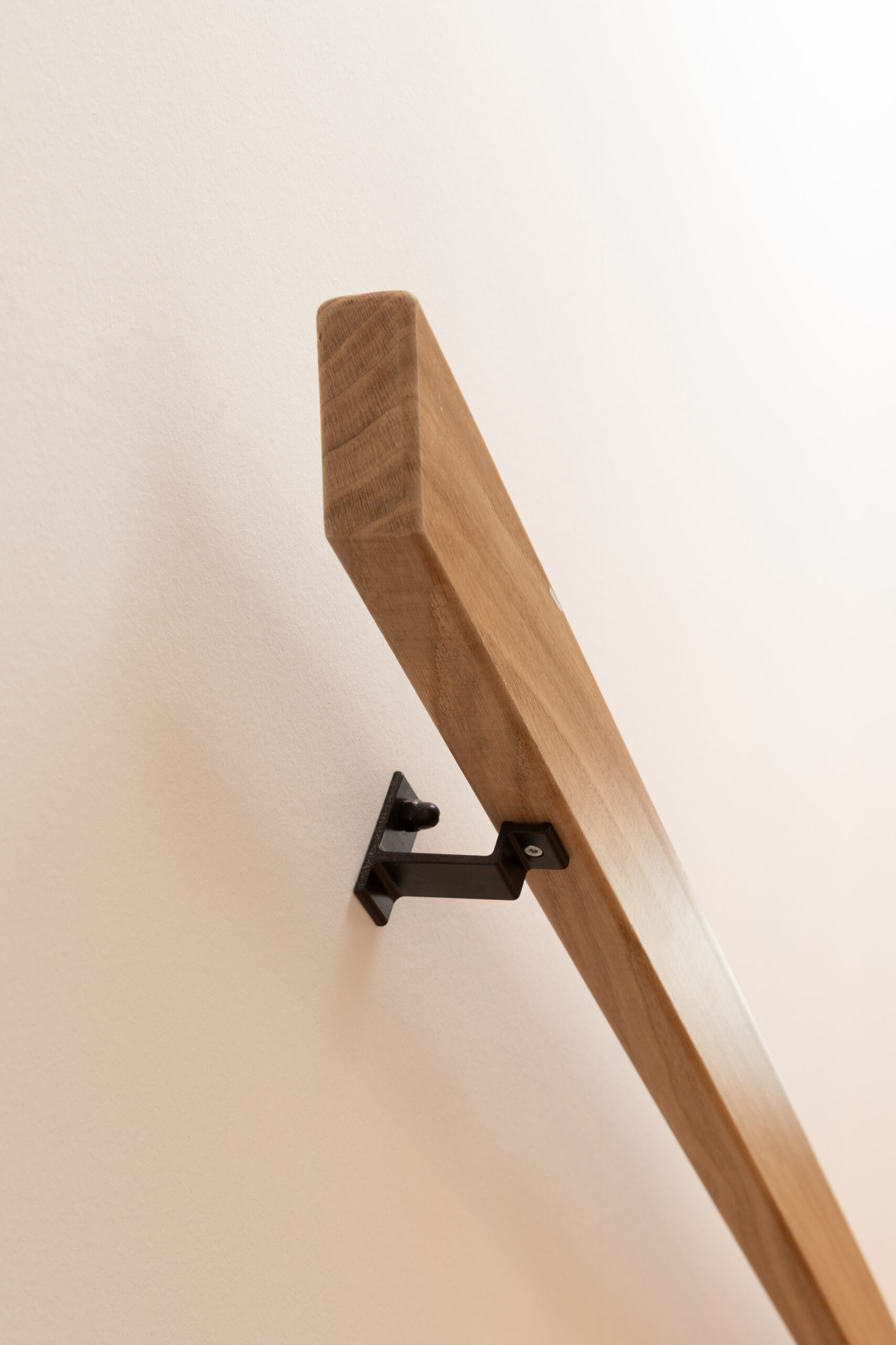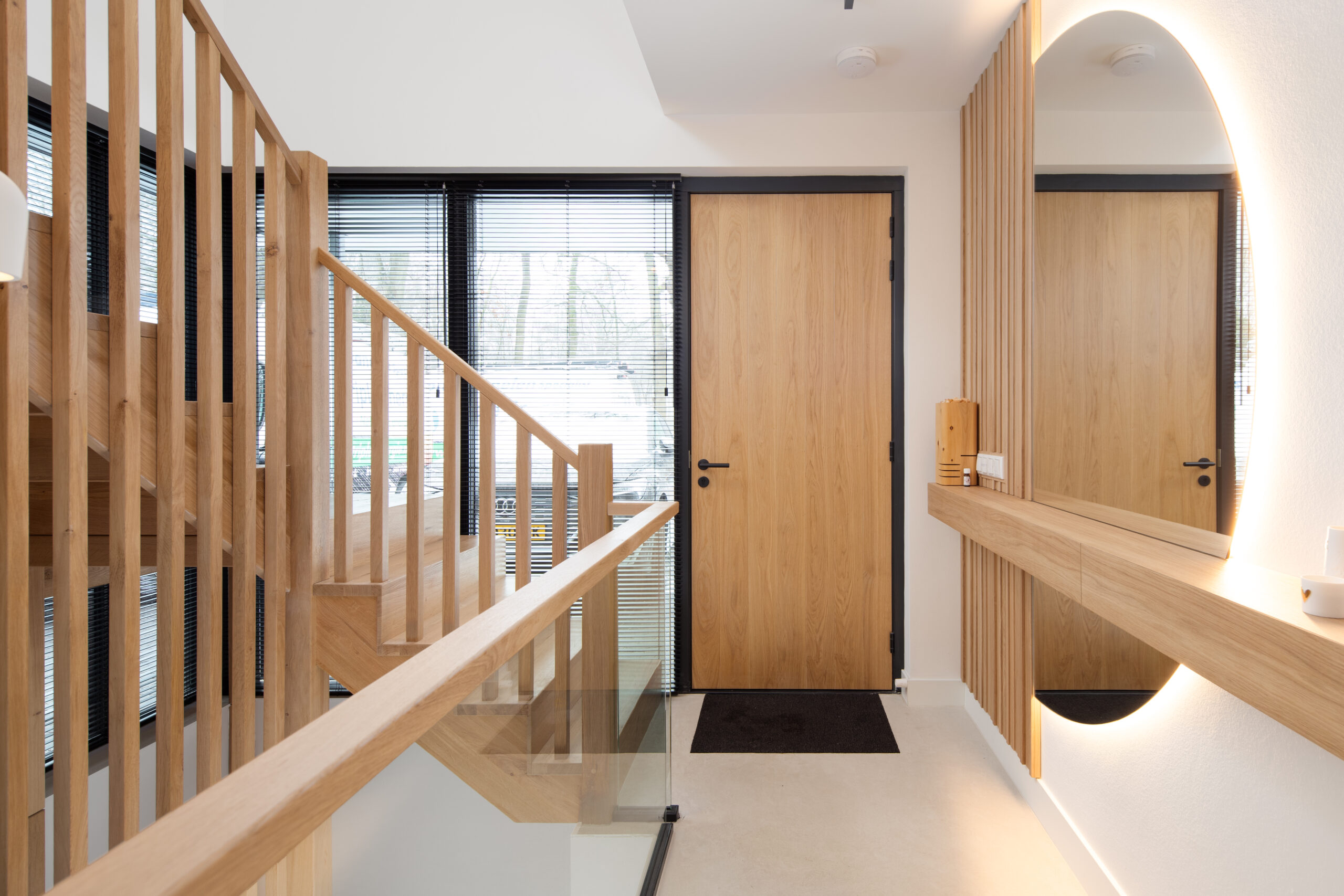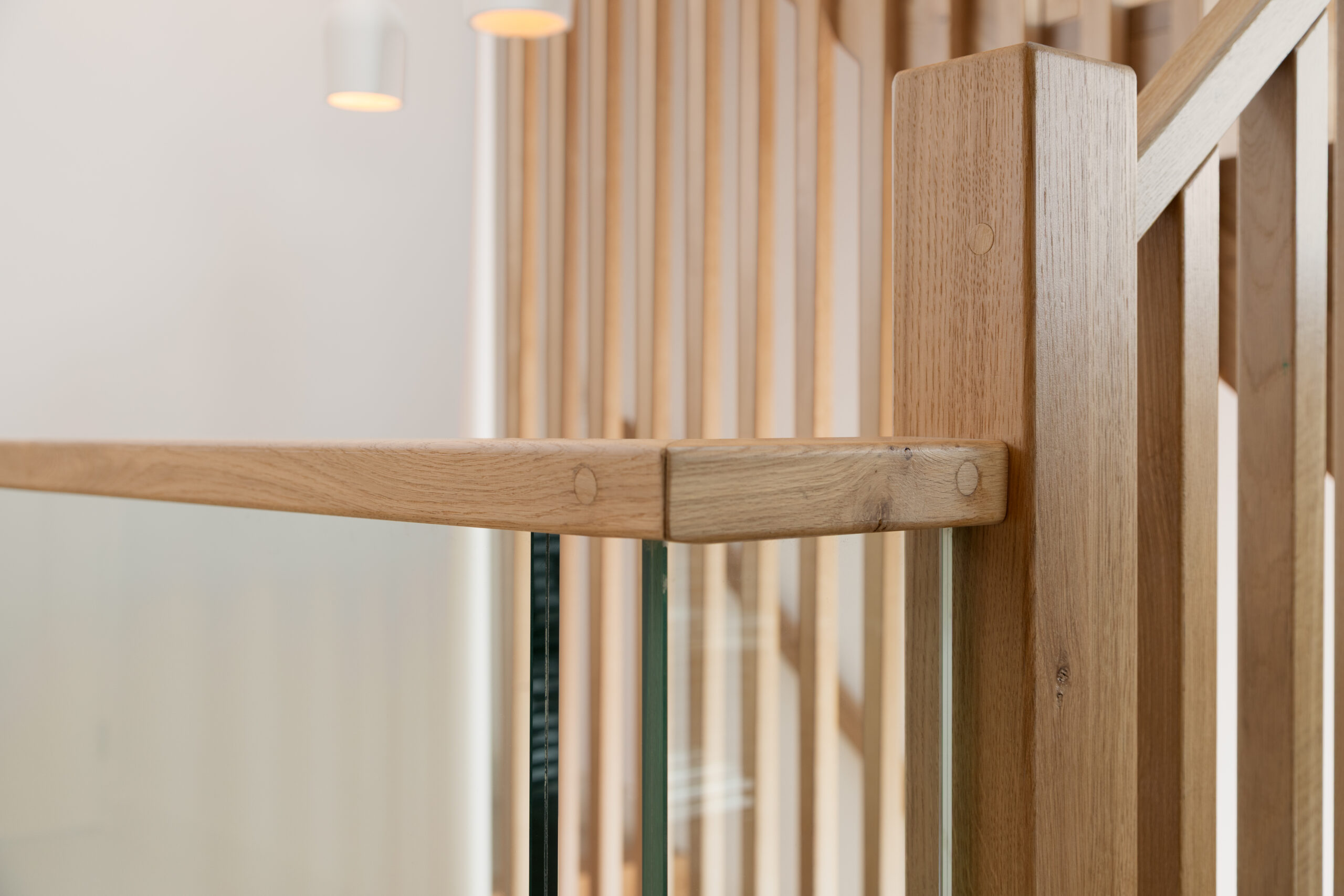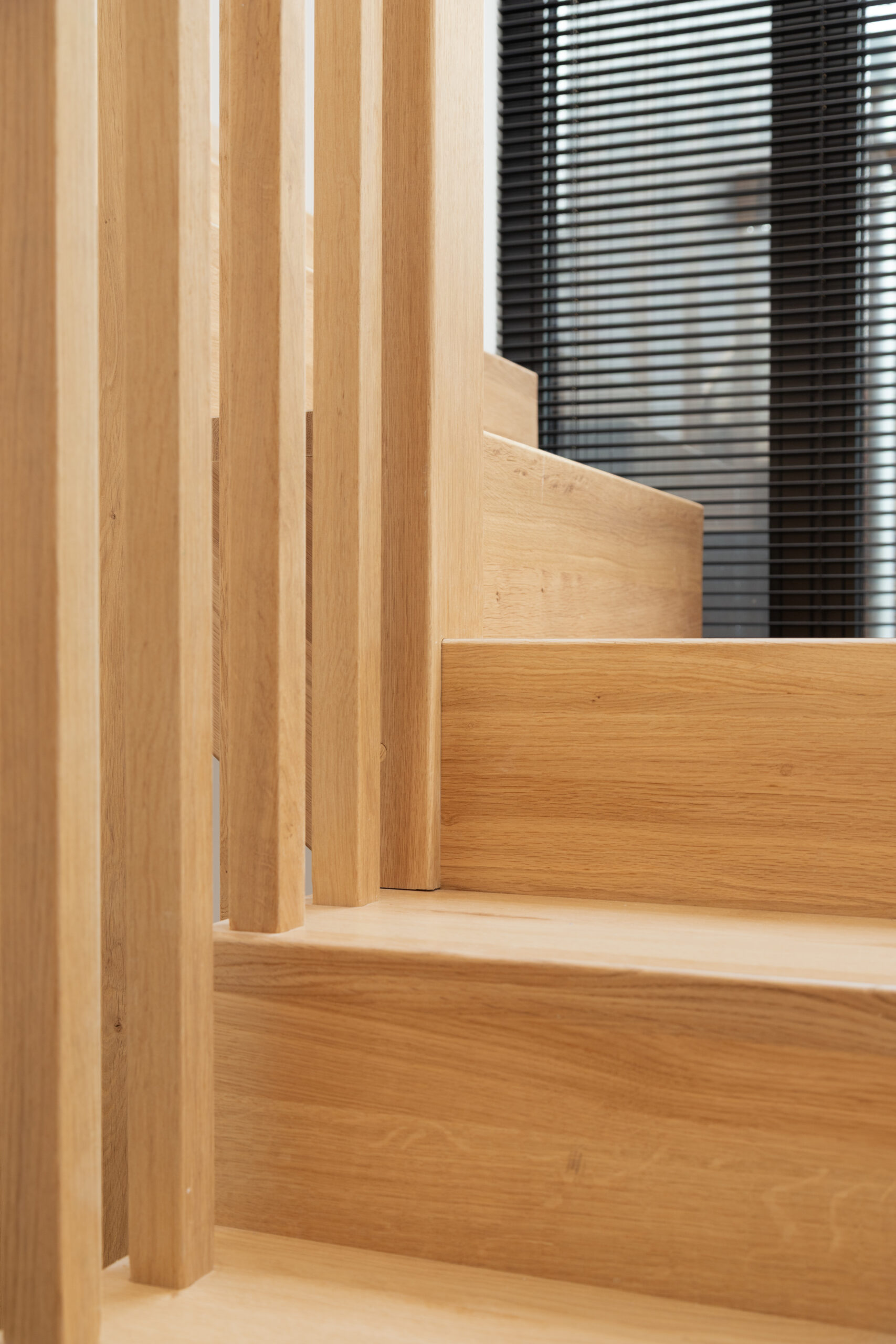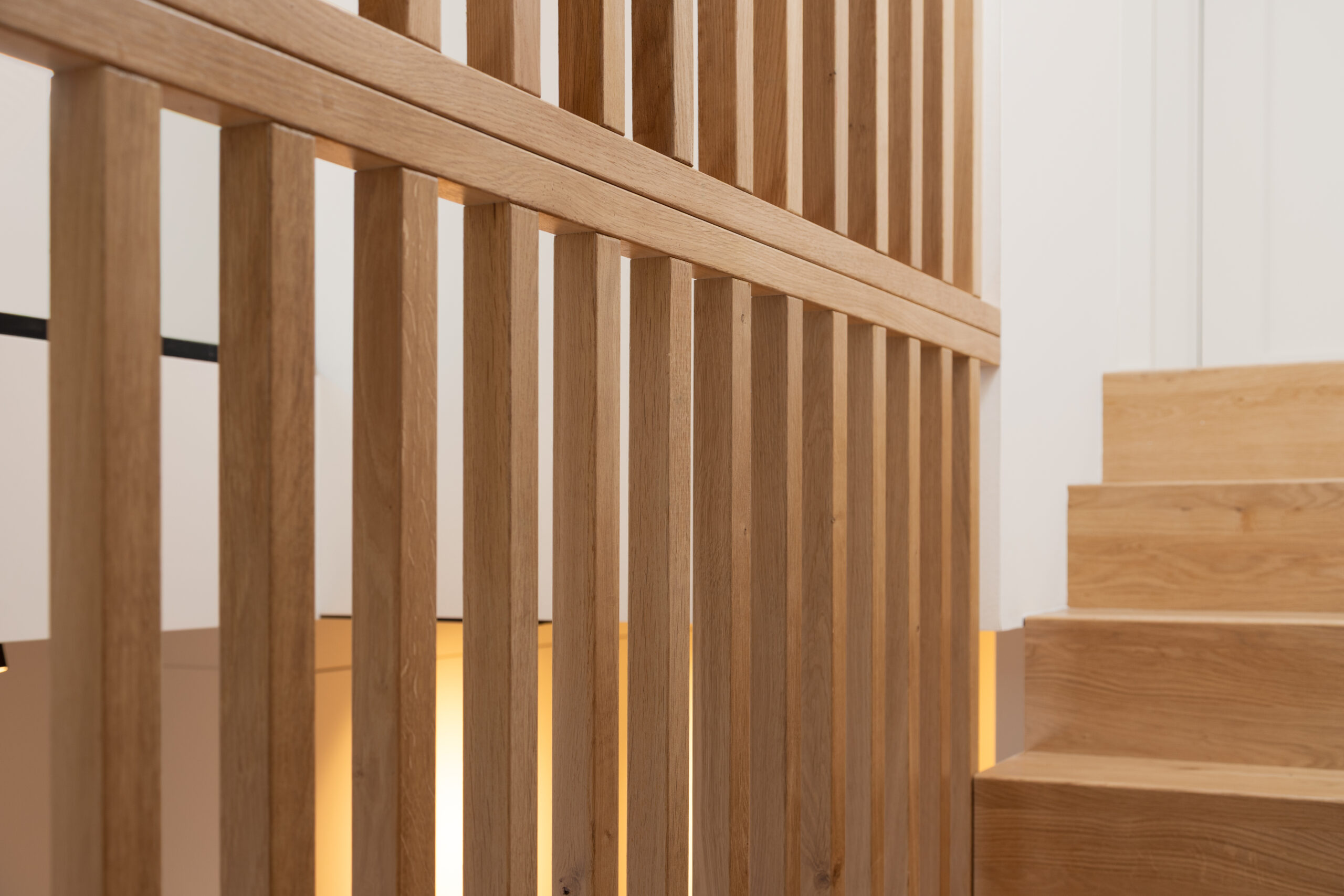 De volledige eikenhouten trappen zijn op locatie opgebouwd. De eiken latten wanden zijn prefab in onze fabriek gemaakt, zodat alles strak past en netjes afgewerkt kan worden. Het was een flinke puzzel, maar het eindresultaat maakt iedereen blij.