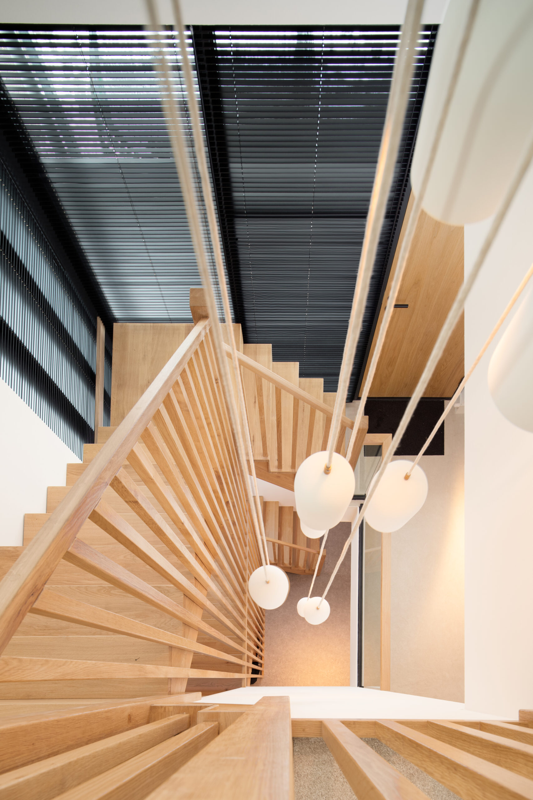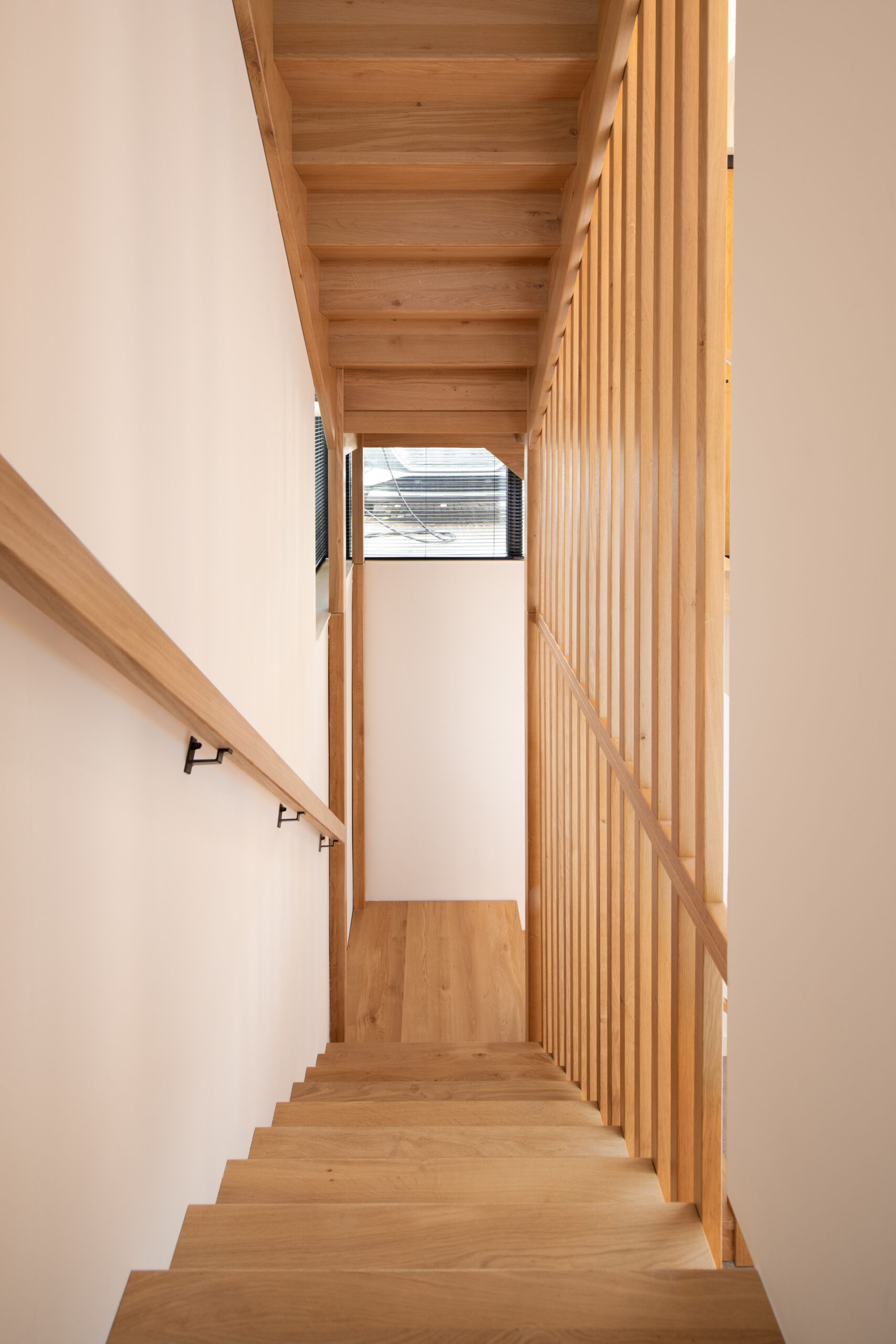 Voor de trappen in deze woning is in een vroeg stadium veel afgestemd. Met een voorbeeld uit de showroom als basis is gekozen voor balustrades langs de trap met eiken latten. Dat geeft de trappen een warme, rustige uitstraling en zorgt voor een mooi geheel in huis.